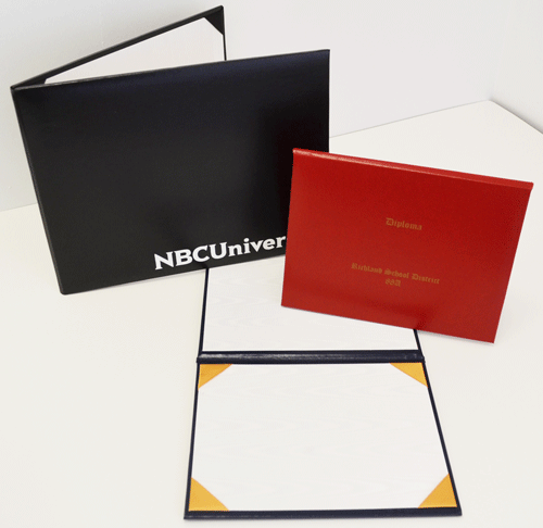 Diploma case covers, award covers, certificate folders can be custom silk screened or foil imprinted with your university's logo or organization's information at wholesale prices. Our diploma case covers come in a variety of colors, sizes and materials. We offer a full line of diploma cover cases, certificate holders, paper certificate holders, leatherette diploma covers, and heat sealed vinyl covers. Make your organization's event memorable by personalizing one of our award covers with your company's logo or information. Looking to make your next special event a success? Have our padded diploma covers foil imprinted with the events information. College diploma certificate cases and homeschool diploma covers come in both horizontal and vertical formats. Call us today for your custom diploma case covers toll free at 1-800-310-2723! We have great quality diploma award covers at fantastic prices and fast service.
